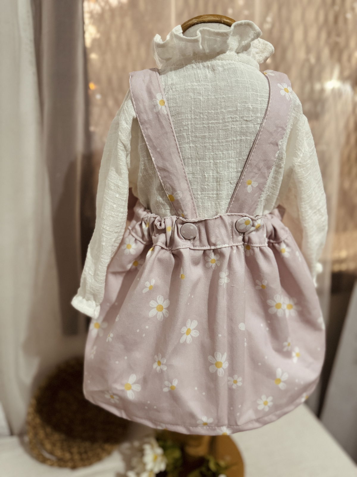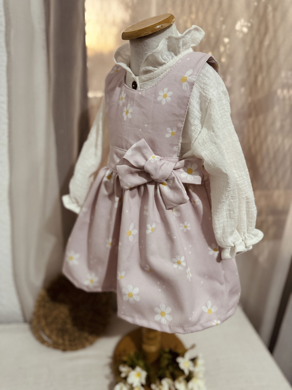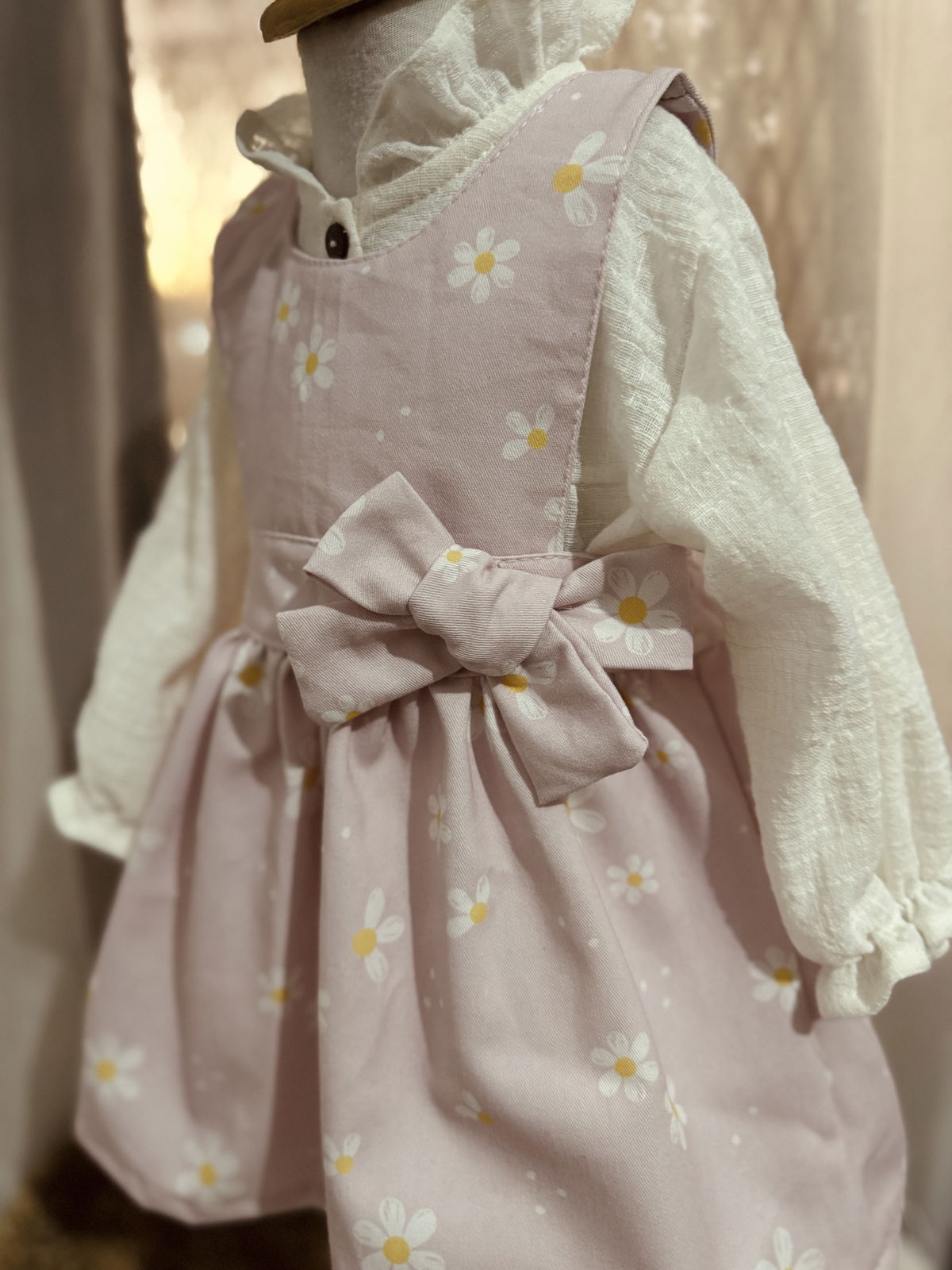 Confeccionado en nuestra molderias con un estampado de margaritas propio y un detalle de un delicado moño..