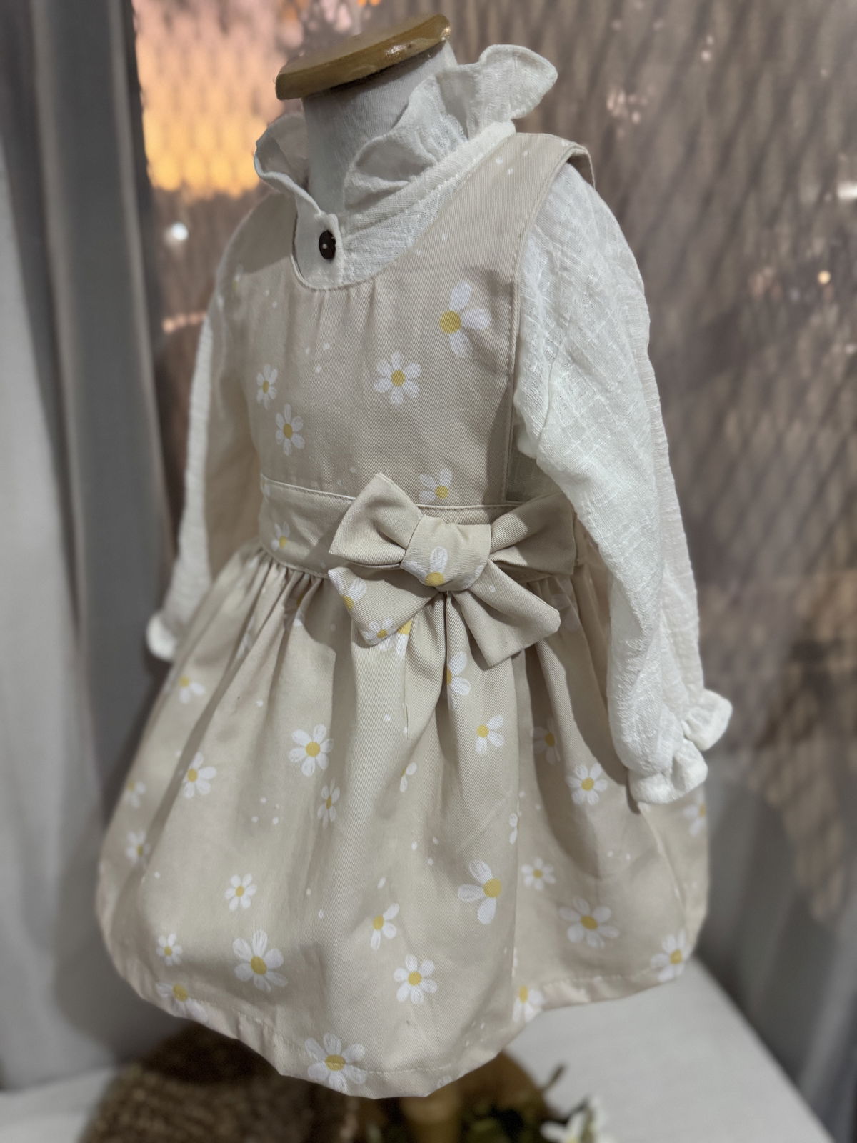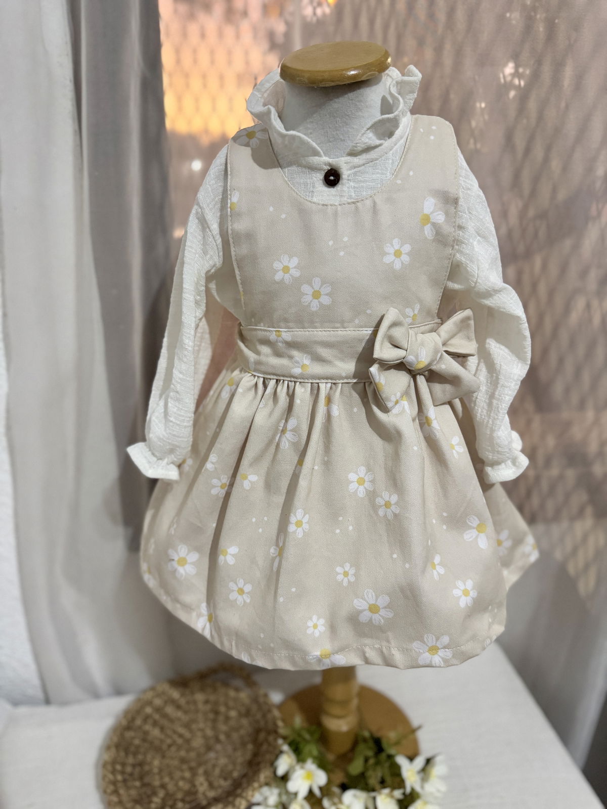 Confeccionado en nuestra molderias con un estampado de margaritas propio y un detalle de un delicado moño..