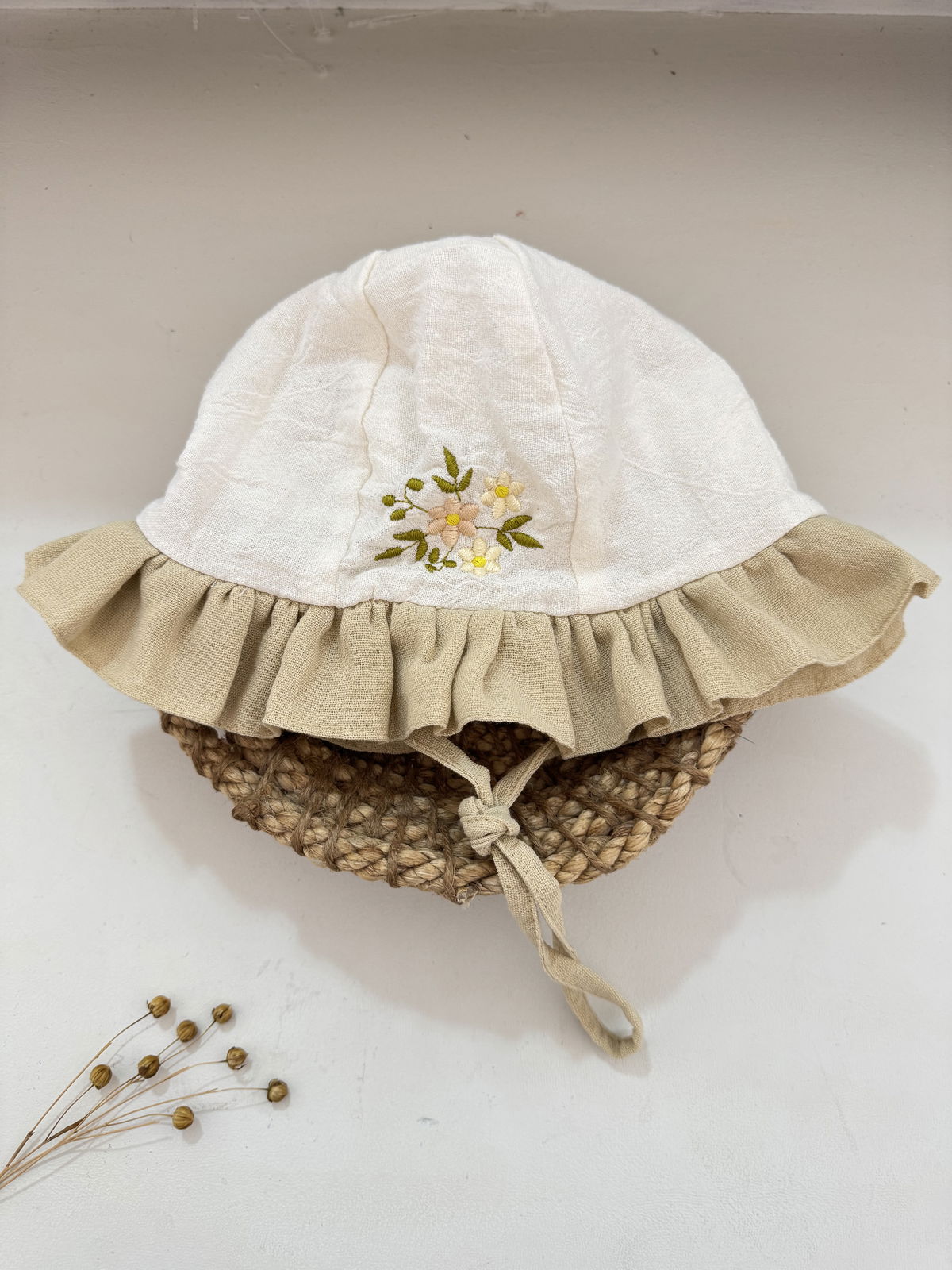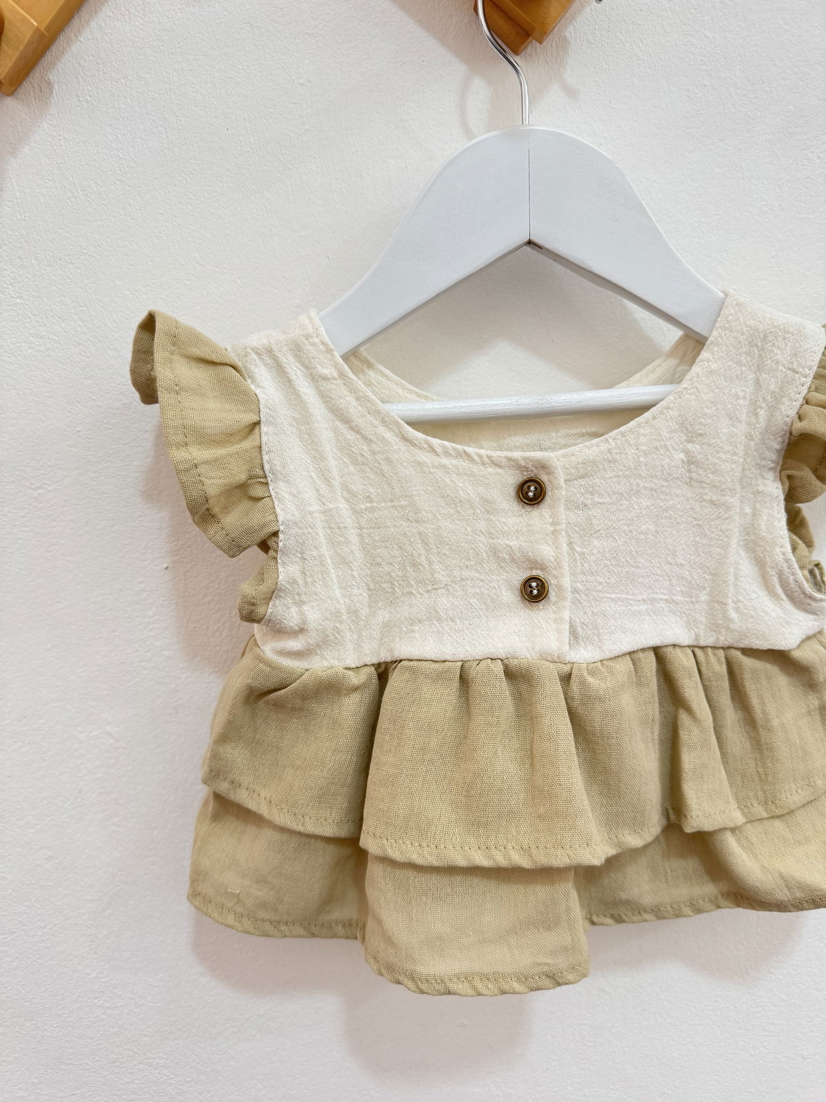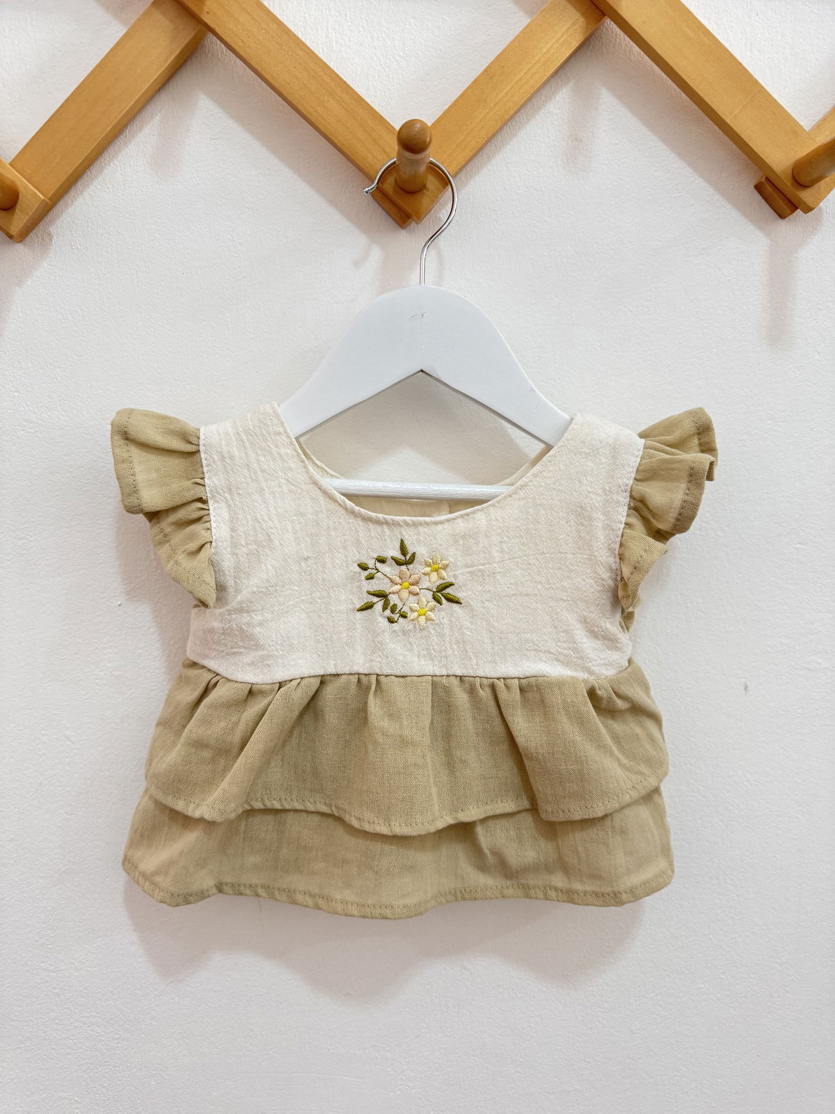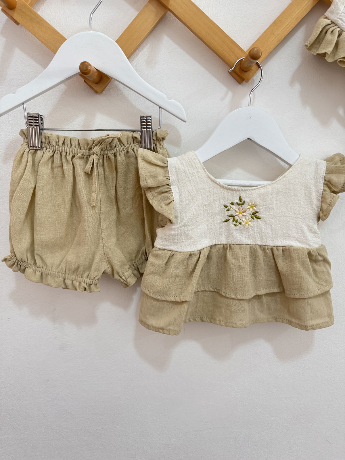 Conjunto delicado y fresco para esta temporada , con un bordado en la pechera a tono , y una coqueta Capelina que viene haciendo juego