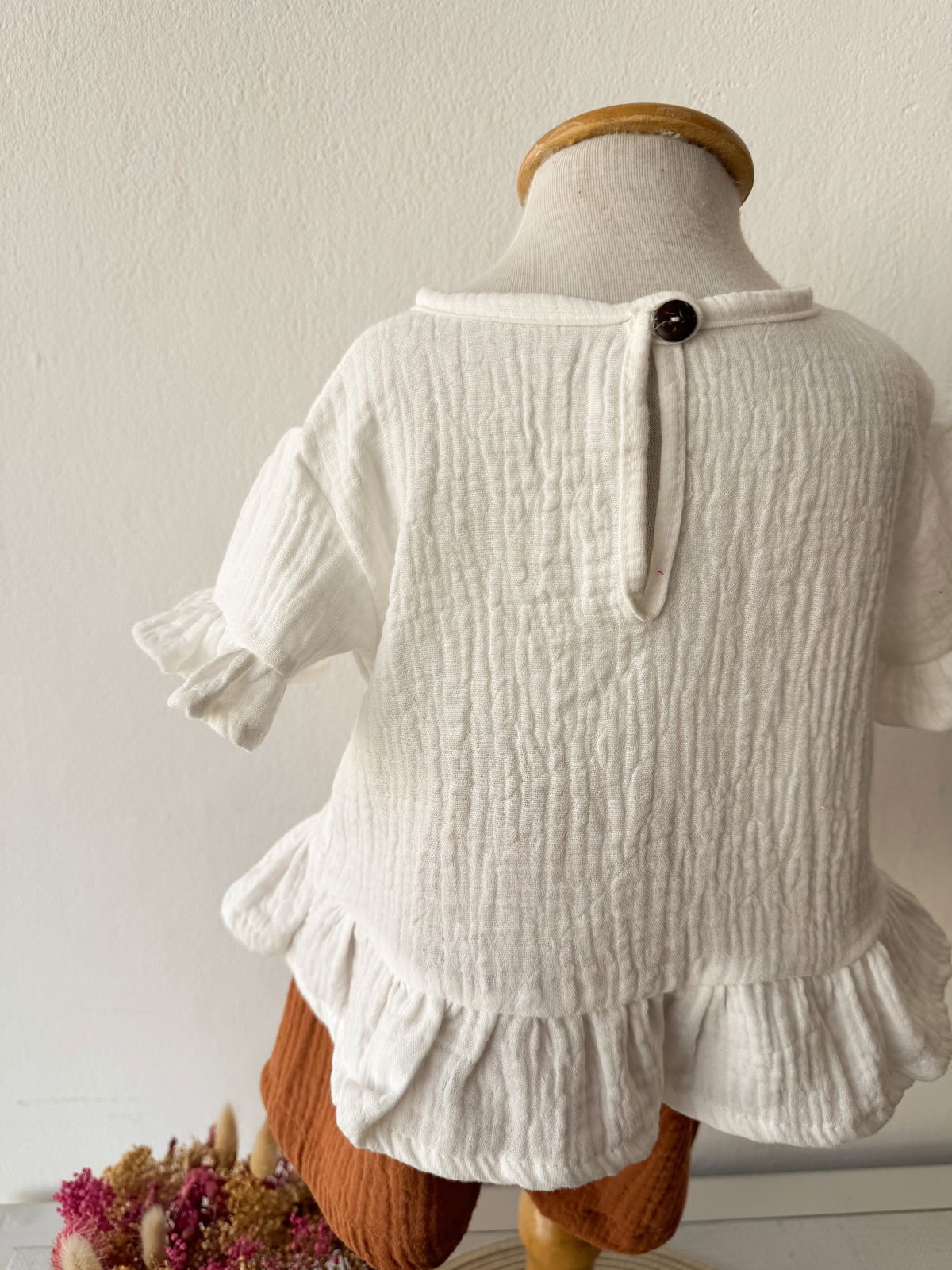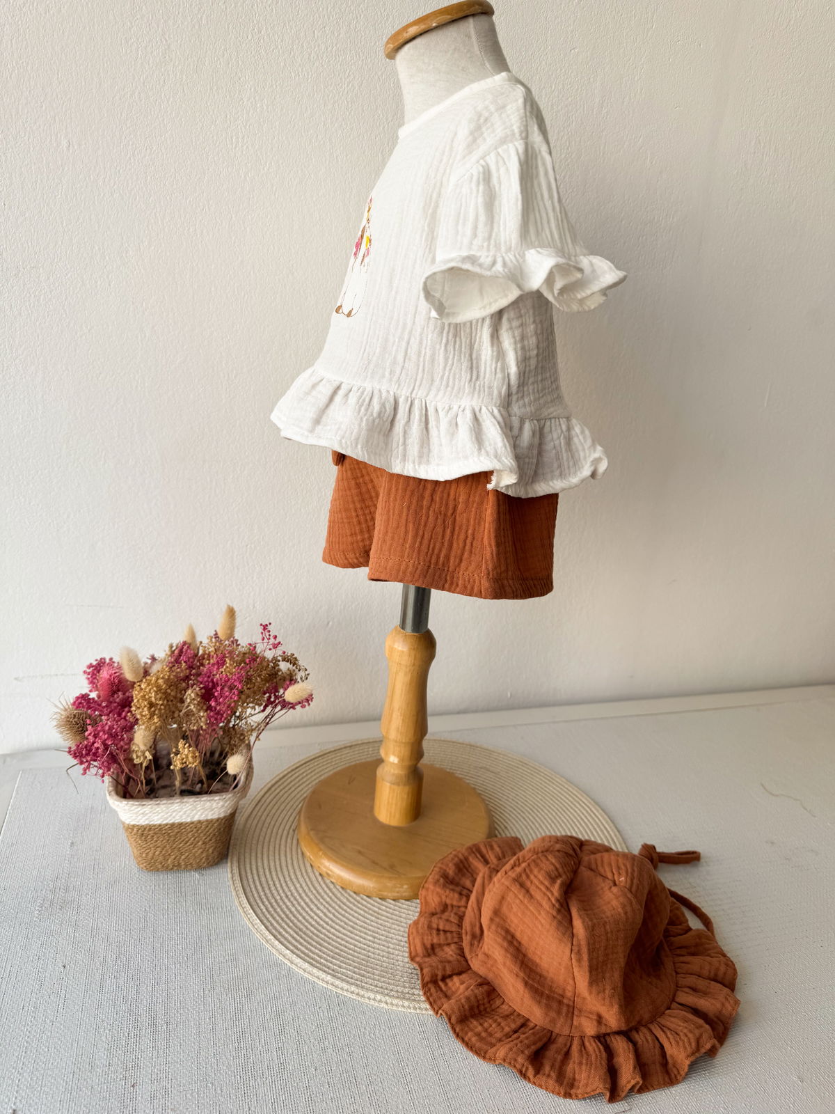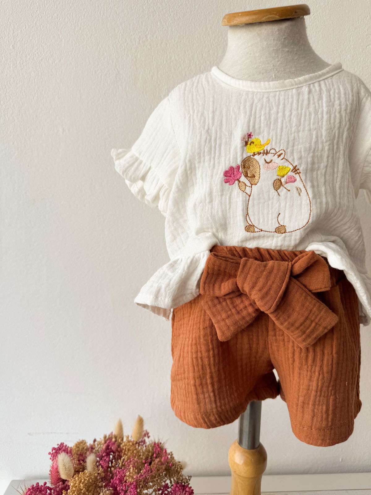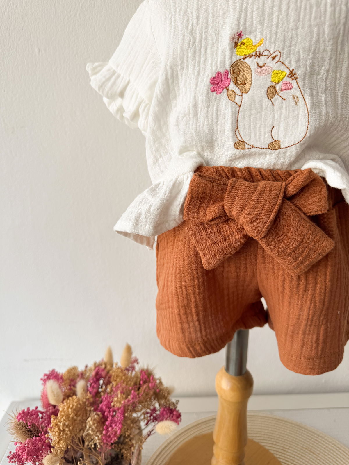 detalles de bordado en la remera .y un delicado shorcito con moño