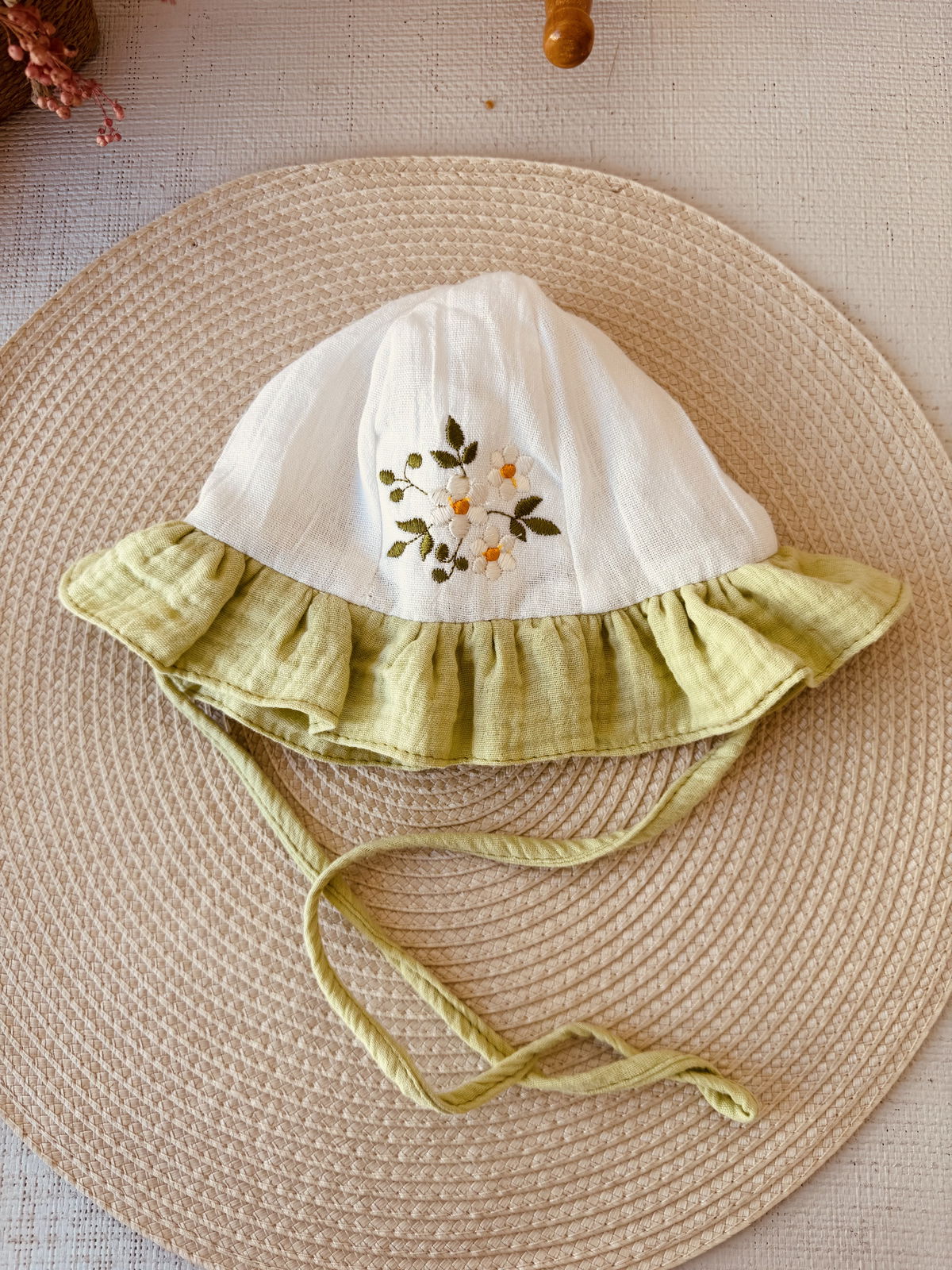 Conjunto delicado y fresco para esta temporada , con un bordado en la pechera a tono , y una coqueta Capelina que viene haciendo juego