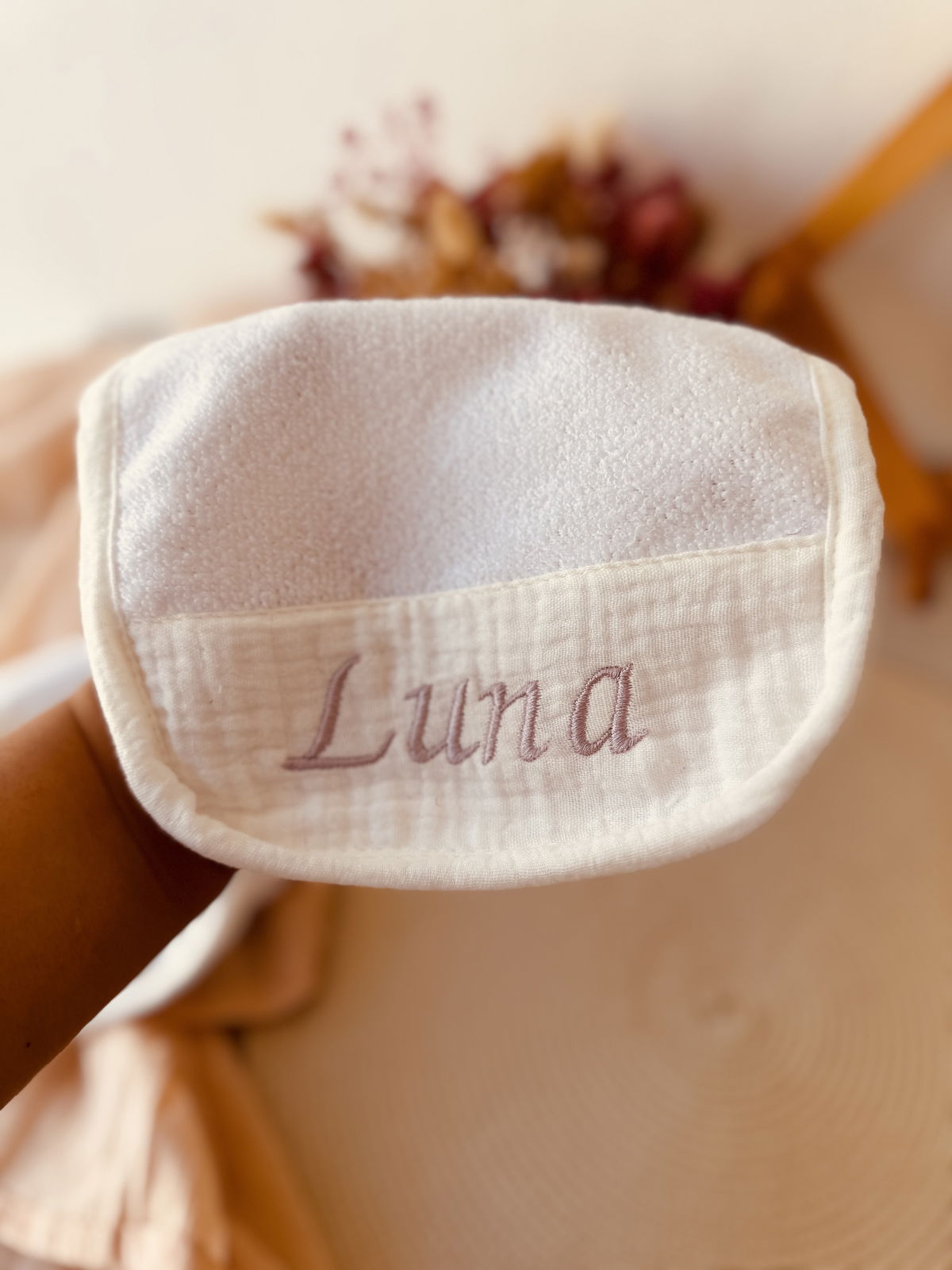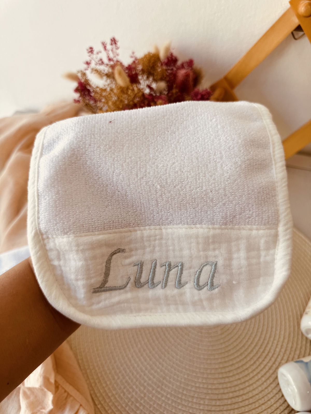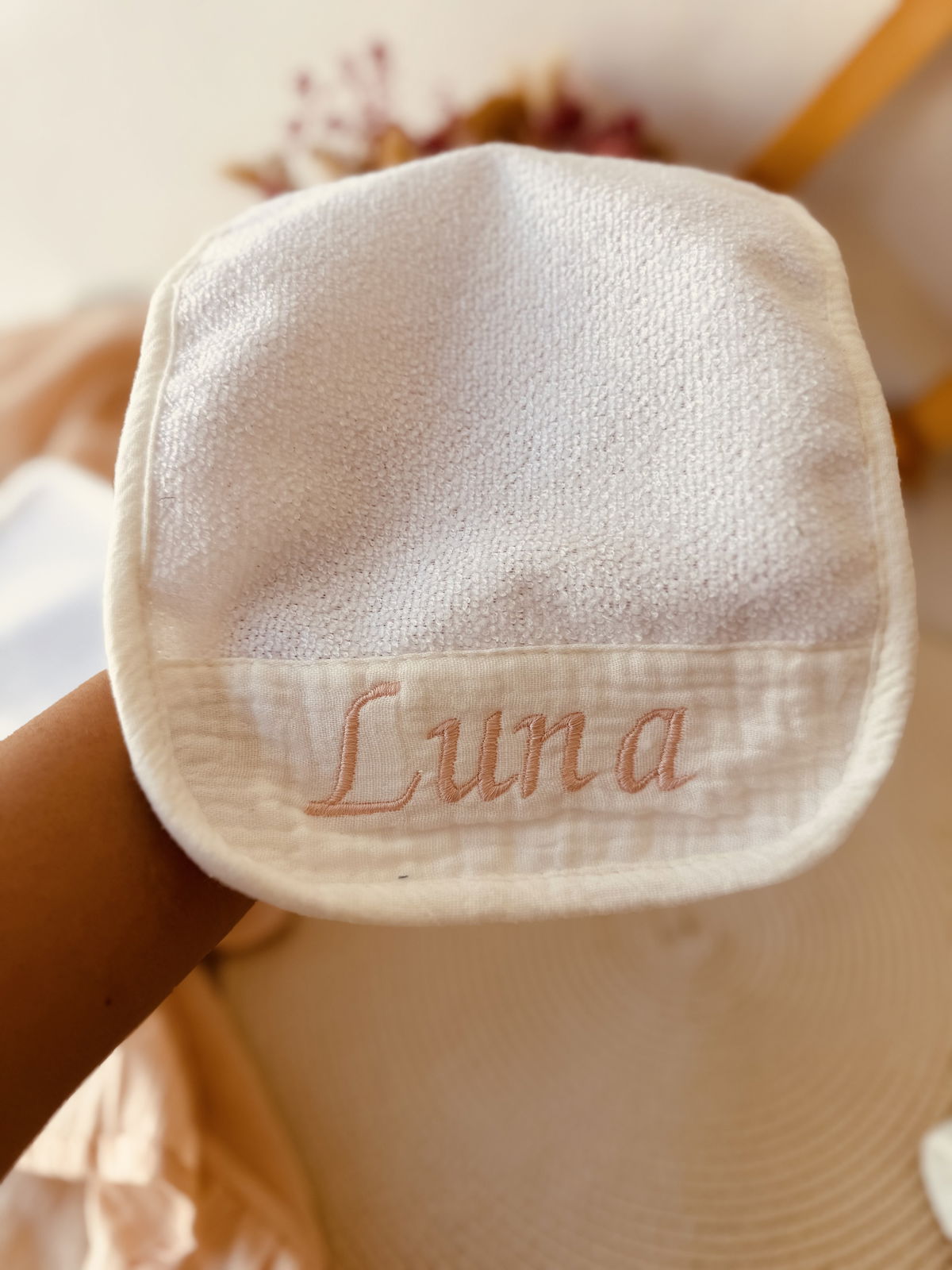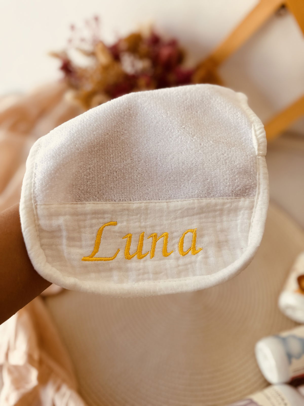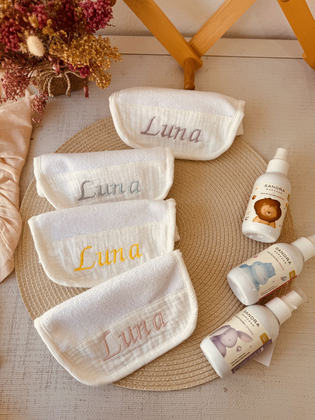 Este set podes personalizar con el nombre de tu bebé , el tiempo es de un día para otro no se demora nada en bordarlos !