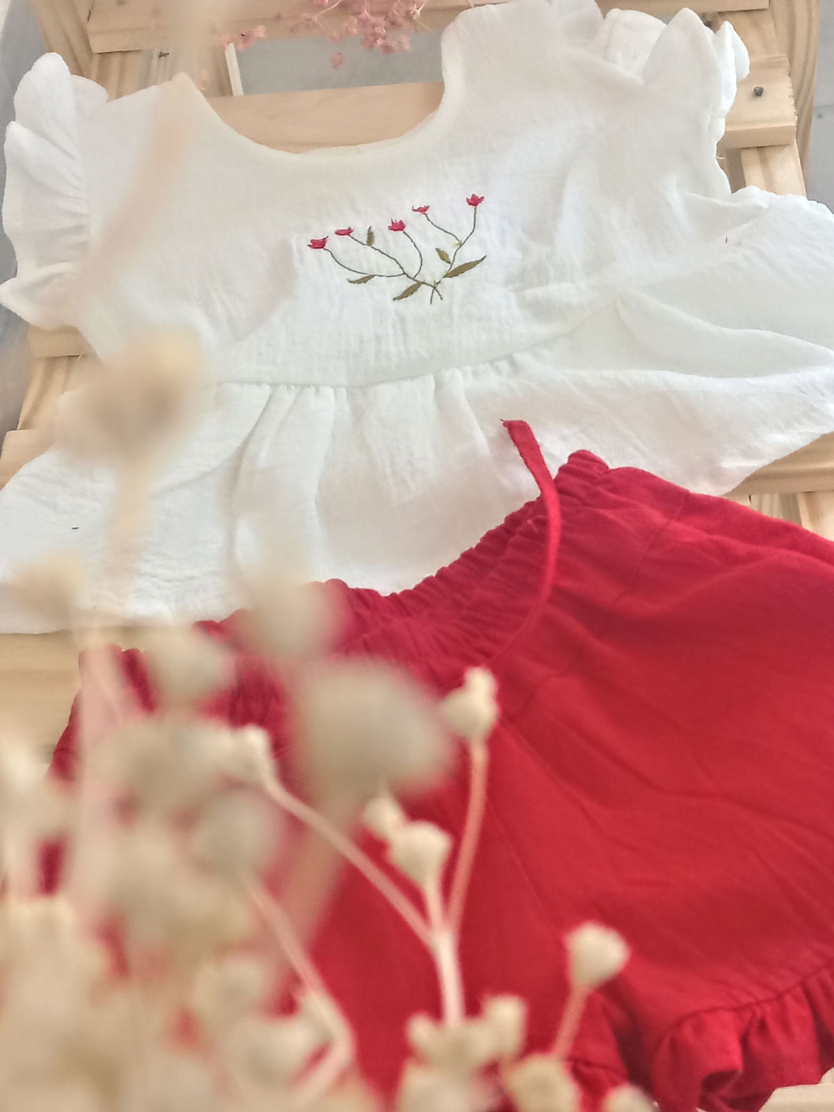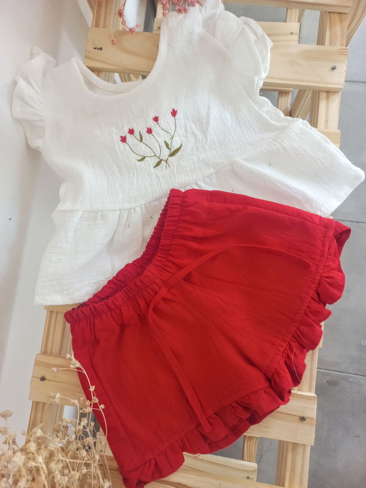 detalles de bordado en la remera .y un delicado shorcito con voladitos