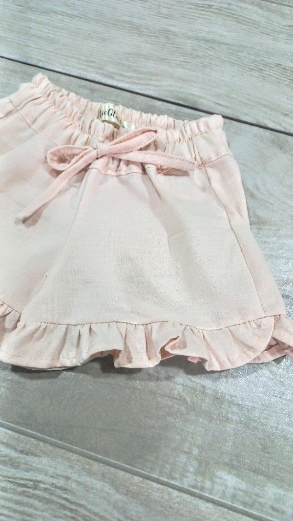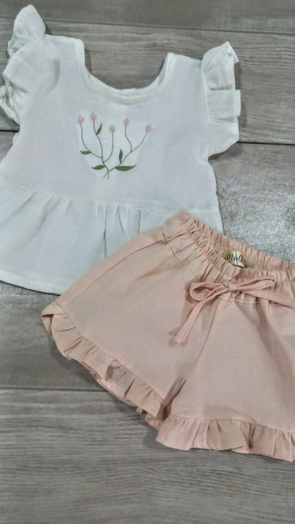 detalles de bordado en la remera .y un delicado shorcito con voladitos