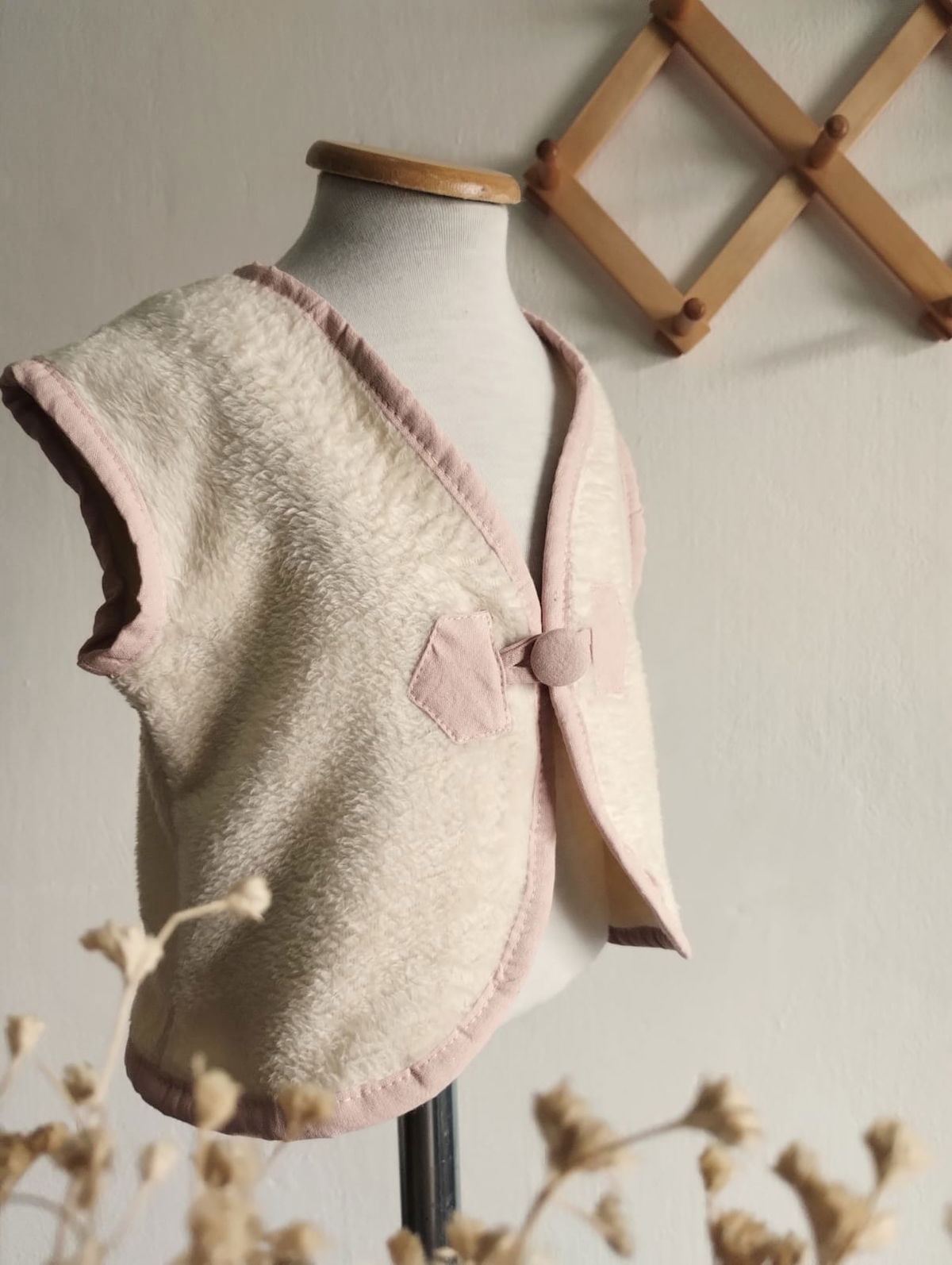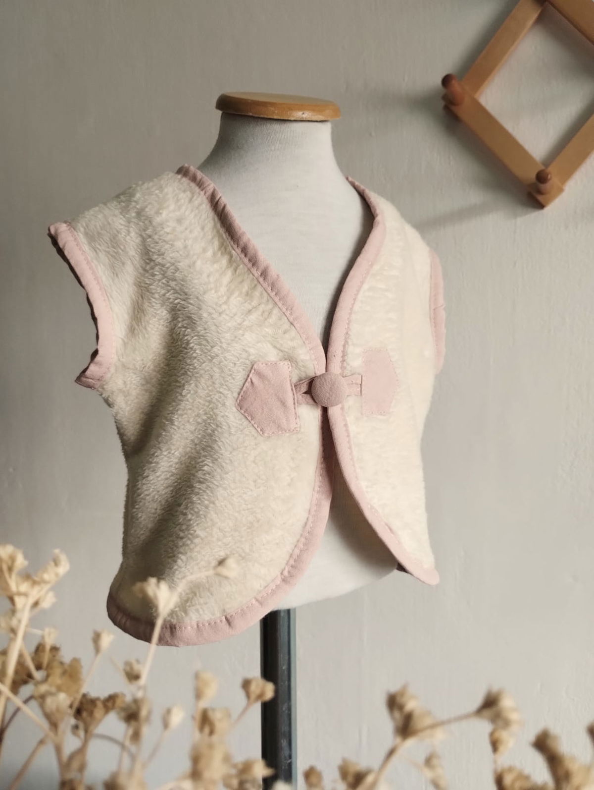 Chalequito confeccionados en polar soft la textura es similar a una pielcita de sueve de pelo corto . Combinacion con Bies y detalle de botoncitos marineros