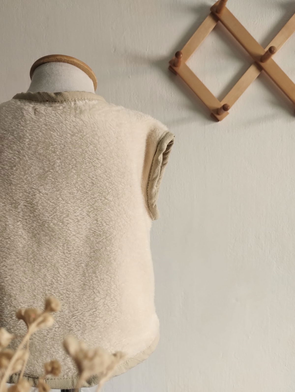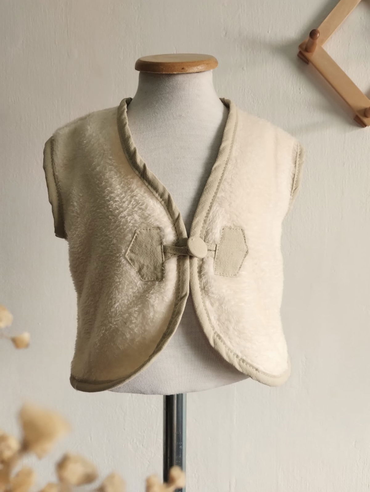 Chalequito confeccionados en polar soft la textura es similar a una pielcita de sueve de pelo corto . Combinacion con Bies y detalle de botoncitos marineros