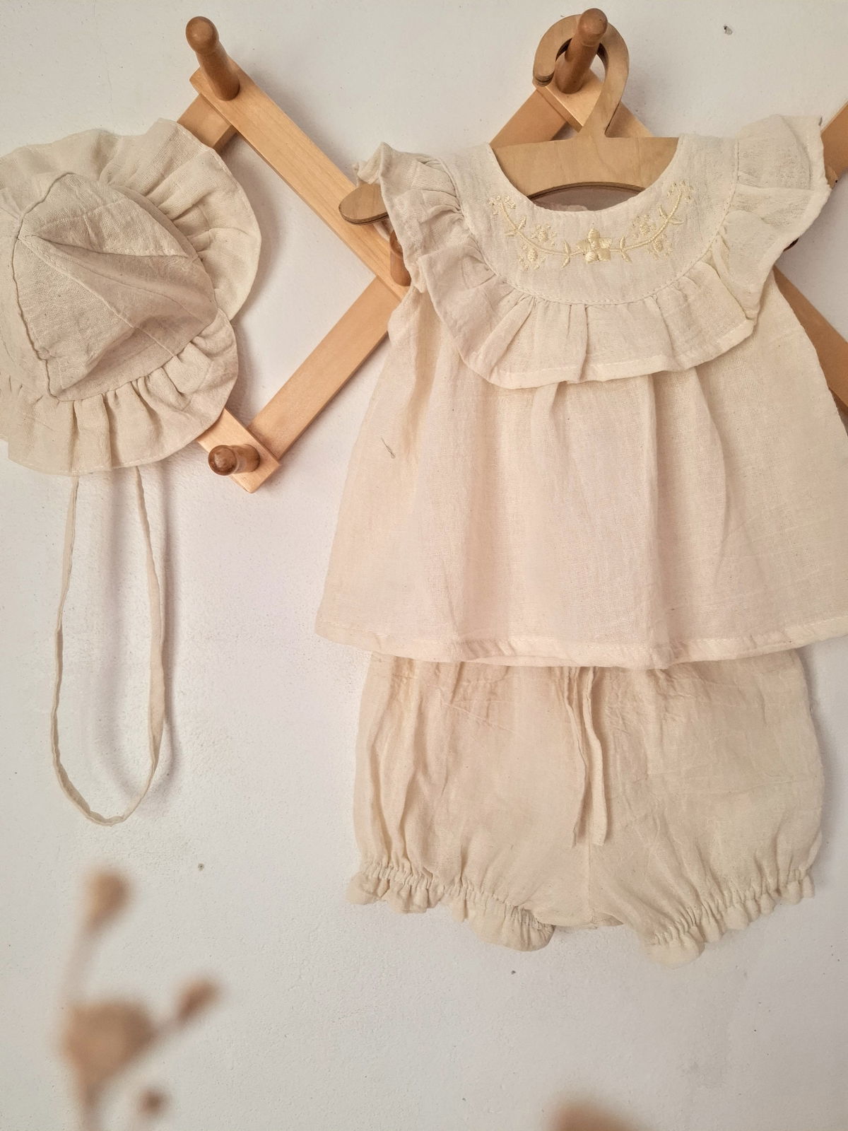 Conjunto delicado y fresco para esta temporada , con un bordado en la pechera a tono , y una coqueta capelina que viene haciendo juego