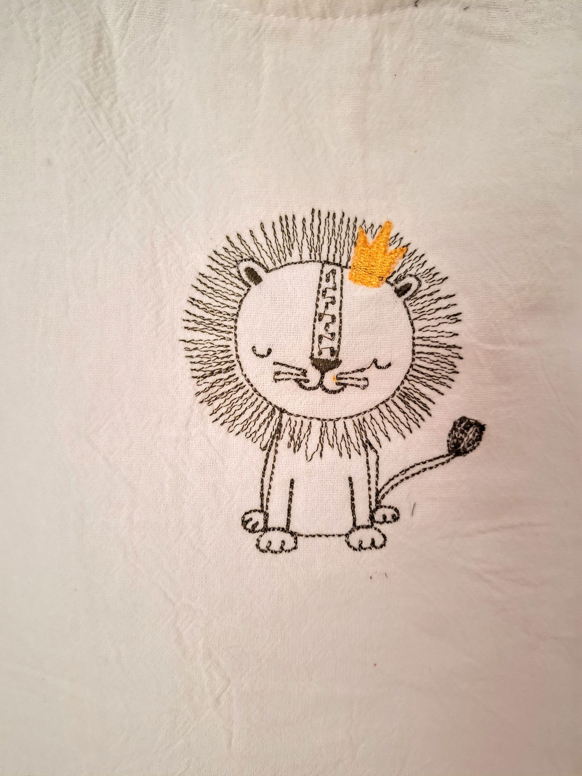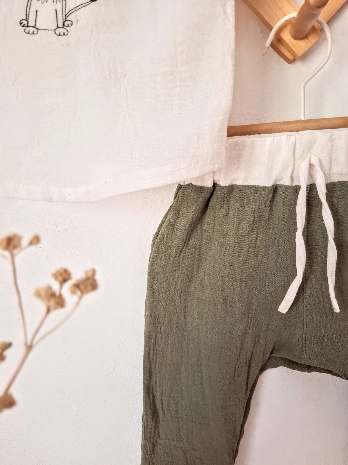 Conjunto delicado y fresco para esta temporada , con un bordado en la pechera de un rey leoncito haciendo juego con el color del pantalon .