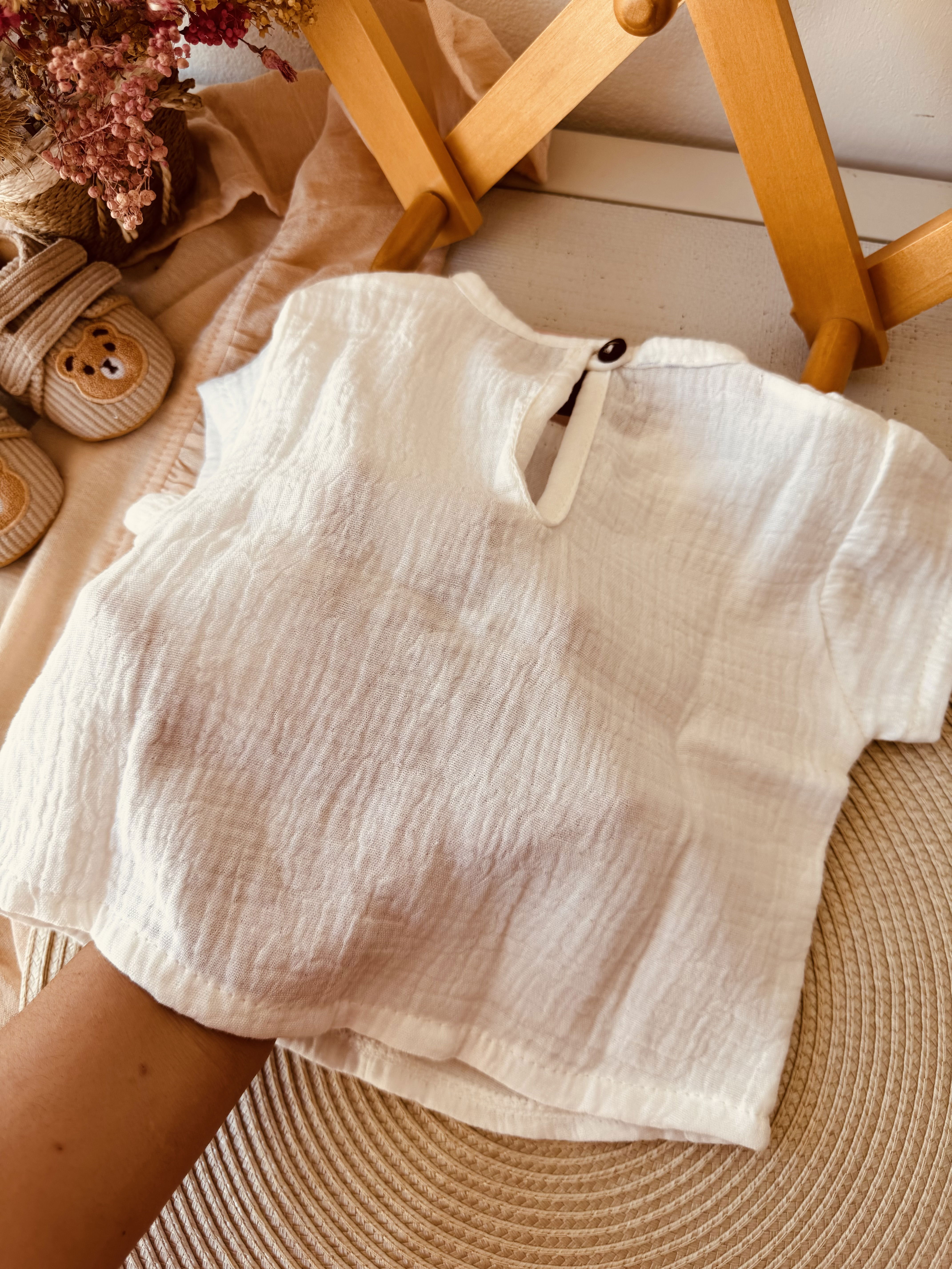 Conjunto delicado y fresco para esta temporada , con un bordado en la pechera de unos ositos y un pantalón short cargo bolsillos laterales .