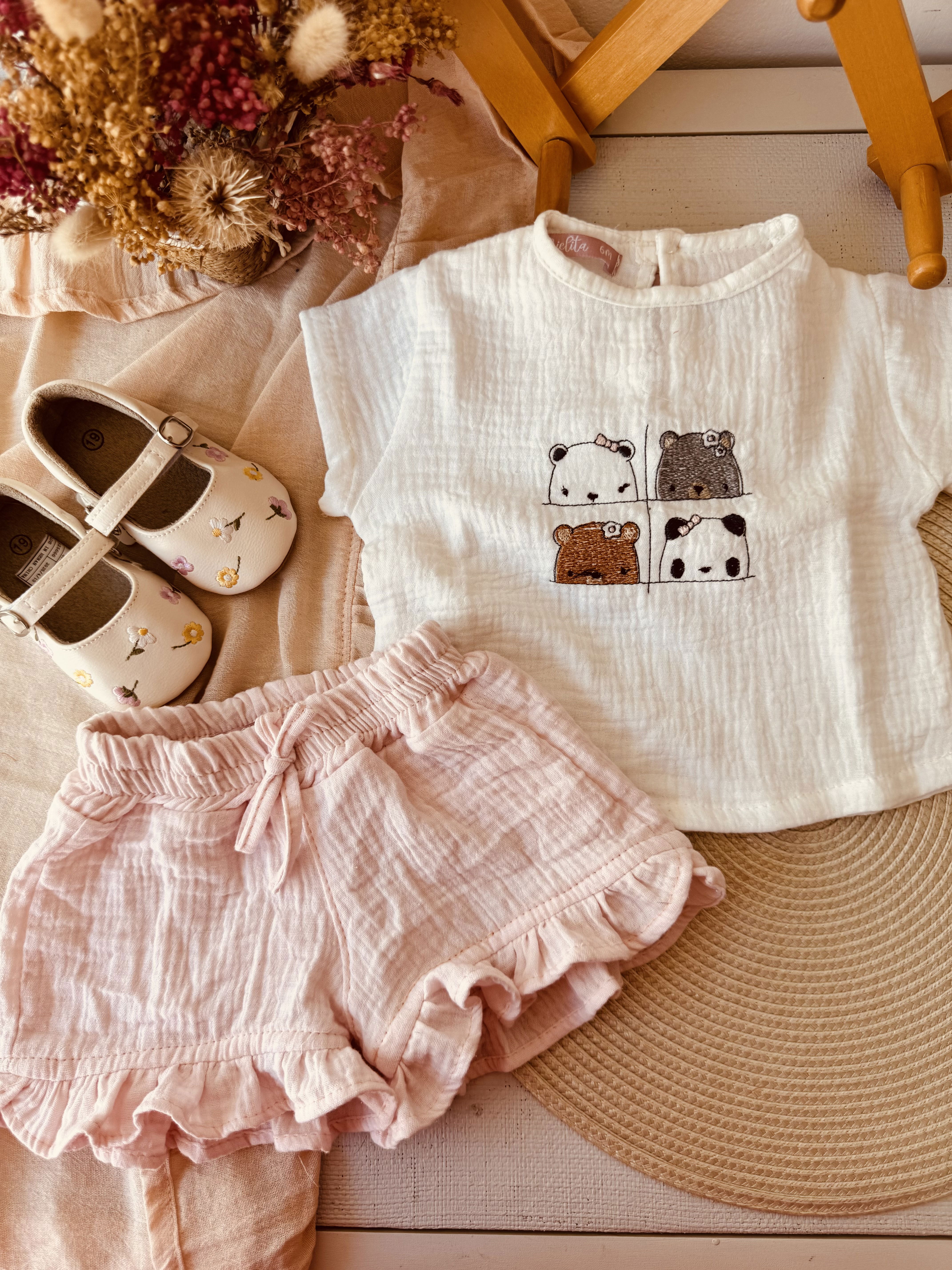 Conjunto delicado y fresco para esta temporada , con un bordado en la pechera de unos ositos y un pantalón short con voladitos .